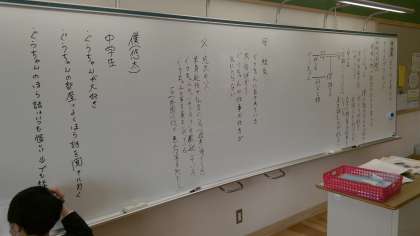 『アイスプラネット』という文学的文章の学習をしています。まずは人物相関図を作成し、登場人物の人物像や関係性を整理しています。20分ほど一人でじっくり取り組み、その後グループで交流しました。自分一人では気がつかなかったことも、グループの人と交流することで新たに気付き、考えを深めることができたようです。