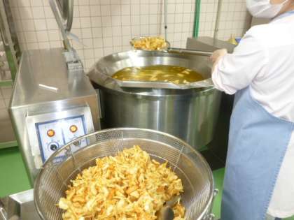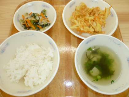 今日はなごみ献立の日です。たけのこやじゃがいも,たまねぎの入った「春野菜のかき揚げ」,鉄分がしっかりとれる「小松菜と切り干し大根と煮びたし」,そして「ゆばのすまし汁」を作りました。