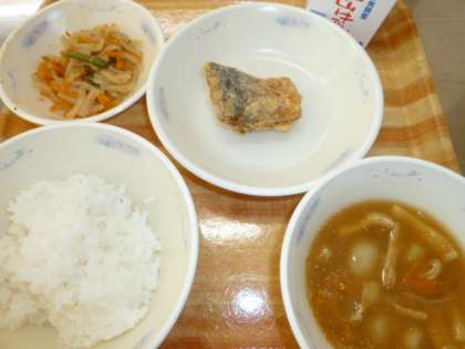 今日の給食は「さばのたつたあげ・野菜のきんぴら・いものこ汁」でした。