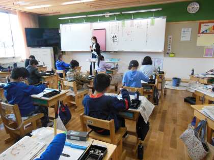 書写の学習が始まりました。4年生では,教務主任の先生が担当します。最初の学習では,用意や片付けの仕方を確認しました。4月26日(月)には,3年生で学習してきた「とめ・はね・はらい」を意識しながら「花」を書きました。