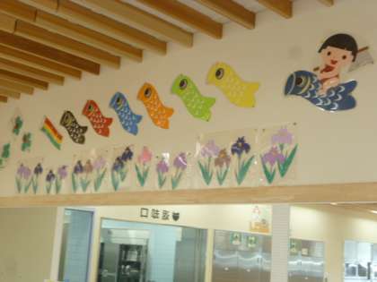 昨日が端午の節句(こどもの日)でしたが,ランチルームにはこいのぼりが元気に泳いでいます。みんなが健やかに成長するようにと,給食調理員さんが作ってくださいました。今月は,こいのぼりに乗った金太郎さんに見守ってもらいながら給食を食べていきます。