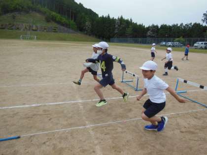 体育科では,「ハードル走」をしています。4年生で初めてする種目なので最初の時間では,ハードルの準備の仕方やとびこし方などのポイントを伝えました。2時間目では,そのポイントを意識しながらハードルを跳びこしていました。