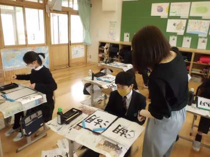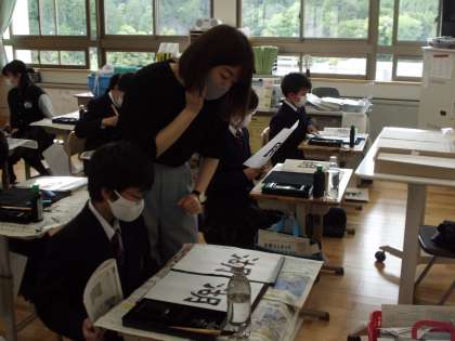 どこがうまく書けたかを後期課程の先生と相談しています。