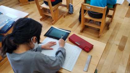 2年生では,タブレットを使って,国語科のデジタル教科書を活用しています。今回は,本文をなぞると,タブレットに文字列がコピーされる機能を使い,たんぽぽのちえについてまとめました。