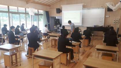本日5校時,1組は国語の授業でした。『構成に着目し,その効果を考える〜ちょっと立ち止まって〜』を本時のねらいに,授業の導入ではクイズもあり生徒たちは楽しそうに学んでいました。2組は音楽の授業でした。『主は冷たい土の中』の学習では,パソコンを使い各自で課題について調べました。