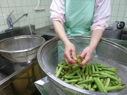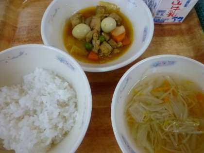 今日は「鶏肉とうずら卵のスパイシー炒め」と「スープ」です。鶏肉とうずら卵のスパイシー炒めには。細野の畑から届いたえんどう豆をむいて,彩に加えました。味つけにはにんにく,カレー粉,トマトケチャップ,ウスターソース,しょうゆを使っています。にんにくや調味料の香りが給食室から広がり,3時間目のころには「おなかがすいてきたな〜」という声が聞こえていました。
