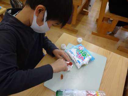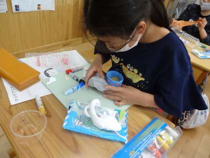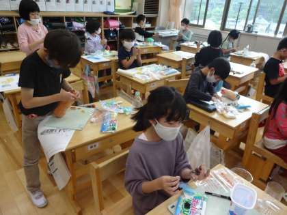 図工の学習で,「空きようきのへんしん」に取り組んでいます。家から持ってきた空きようきに絵の具をまぜた紙粘土をつけて,自分だけの小物入れを作りました。はじめにどんな物を作りたいかスケッチし,それを元に作っていきました。作っていく中で,アイデアがさらに出てきて,考えていた物よりも素敵な作品になりました。次はみんなの作品を鑑賞する予定です。