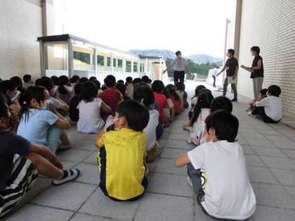 事前にパワーポイントを見て,火事のときに怖いのは火と煙であるということや,避難のときに大切な「お・は・し・も・て」,姿勢を低くしてハンカチで口をおさえて避難するということなどを確かめました。