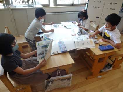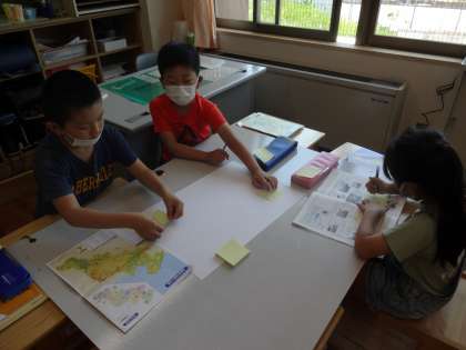調べるのに,写真や地図,教科書を使っています。写真を見て気がついたことや,地図を見て見つけた地域とのつながりなどを一人一人が付箋に書いていき,同じまとまりごとにまとめ,最後に発表する予定です。