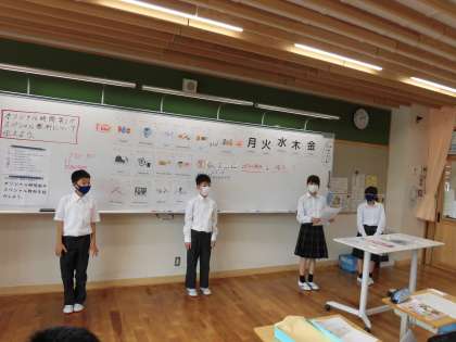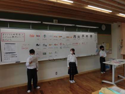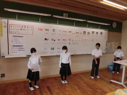 グループでオリジナルの時間割を考えました。好きな教科を入れたり,スペシャル教科を入れたりするなど,自由な発想で時間割を作っていました。そして,最後はグループごとにみんなの前で,オリジナルの時間割を発表することができました。