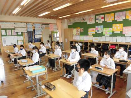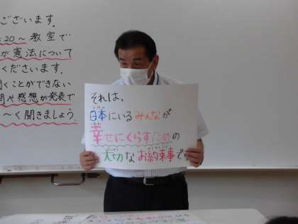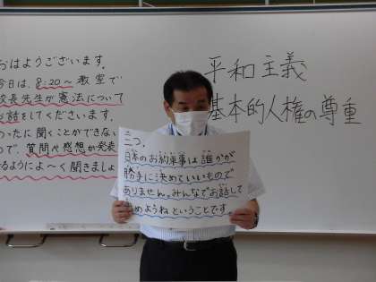 校長先生から,憲法に関したお話がありました。校長先生のお話に,子どもたちは熱心に耳を傾けていました。「国民主権」「平和主義」「基本的人権の尊重」は「生徒が主役」「けんかをしない」「一人一人みんなが大切」と同じであることを理解し,憲法の考え方は,自分たちの日常生活にも生かすことができることに気付くことができました。