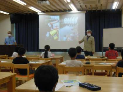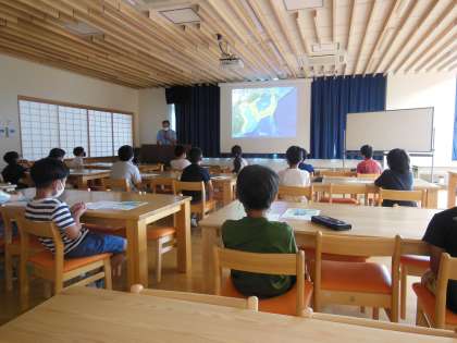 7月9日(金)京北ふるさと未来科の学習で,「アユのくらしを知ろう!」というテーマで京都市産業観光局の方にお話ししていただきました。一般的にアユは10月ごろから川を下りその後,小石のある底で卵を産み生まれたアユの子どもは,川の流れに乗って海まで行きそこで海の豊富なプランクトンを食べて成長し川を上がることを写真や動画を使い教えてもらいました。