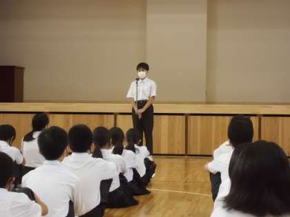 集会の初めは学級の様子と2学期の目標を発表しました。