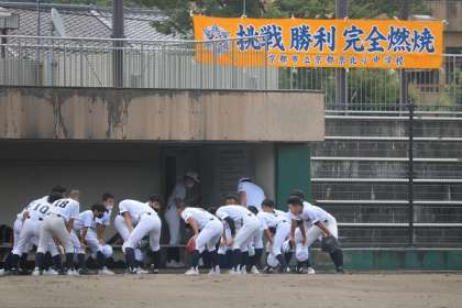7月18日(日)に岡崎球場で双ヶ丘中学校と3回戦が行われました。2回裏の攻撃に9年生の活躍で3点を先制し,その後も追加点を重ねながら粘り強く試合を進め5−2で勝利を収めました!新人戦で敗れた相手にリベンジを果たし,これでベスト8に進出です。次の試合は府下大会出場をかけて21日に行われます。応援よろしくお願いします。