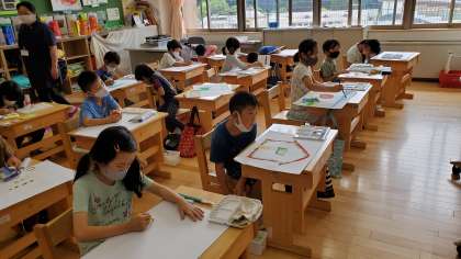 図画工作科の学習では,「カメレオンのかきごおりや」というお話を読んで,絵を描きました。はじめの時間には,どのようなかき氷を描こうか考えながら画用紙を切り,かき氷の形を作りました。