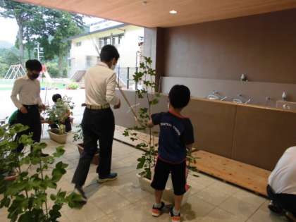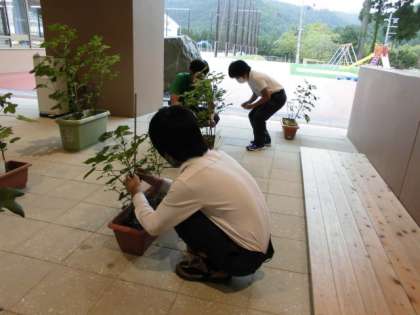 ずいぶん背が伸びたワタもあり,その高さに合わせて支柱を選び,立てていきました。後期と前期の生徒たちが二人で支柱の長さを選ぶ相談をしたり協力したりする姿も見られ,微笑ましく思いました。