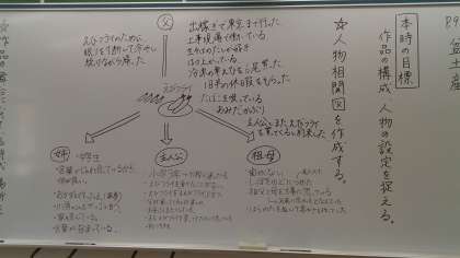 まずは登場人物の整理をするために、人物相関図を作成しました。個人で作成した後、グループ交流→全体交流し、人物像の理解を深めていました。