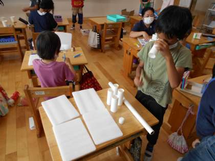 京北ふるさと未来科の学習では,「あそんでためしてくふうして」に取り組んでいます。今日から,みんなで楽しめるおもちゃ作りが本格的にスタートしました。きりを使って穴をあけたり,ストローや割り箸を組み合わせてタイヤを作ったり,みんなで楽しめるおもちゃを工夫して作っています。友達とアイデアを出し合いながら作っている子も多く,友達の良いアイデアは積極的に取り入れている姿も見られました。