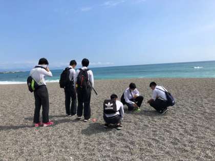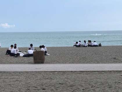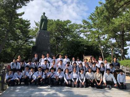 桂浜に到着しました。目の前に広がる太平洋は、瀬戸内海とは全く違う風景です。浜辺に建つ龍馬と一緒に、遥か水平線の彼方に想いを馳せます。