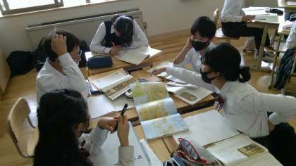 書いてある内容+他教科で学習した内容やテレビなどで見聞きした情報を頭の中でつなぎ合わせながら考えていました。パズルのピースが一つずつはまっていくような感覚でしょうか。思考のつながりが見て取れる授業になりました。