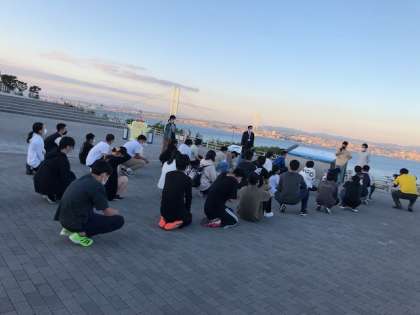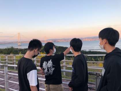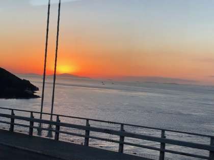 修学旅行で通過する最後の橋、明石海峡大橋がそして、瀬戸内海に沈む夕陽がとても美しいです。