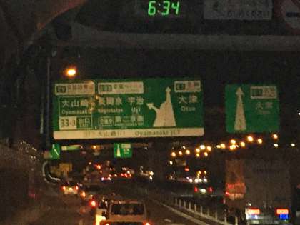 道路は渋滞もなくスムーズに流れ、18時35分に大山崎JCTを通過しました。予定より30分早いペースですので、19時30分頃学校到着予定となります。この後、園部インターと日吉のあたりの通過時刻をお知らせいたします。