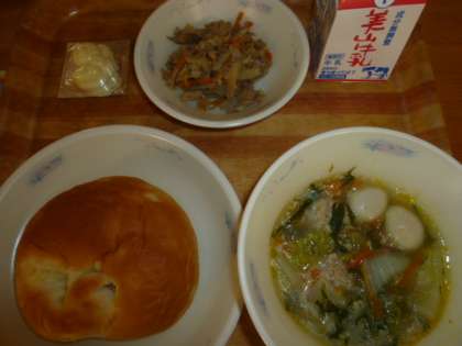 今日の献立は,「おさつコッペパン・牛乳・肉団子のスープ煮・ごぼうのソテー・型チーズ」です。