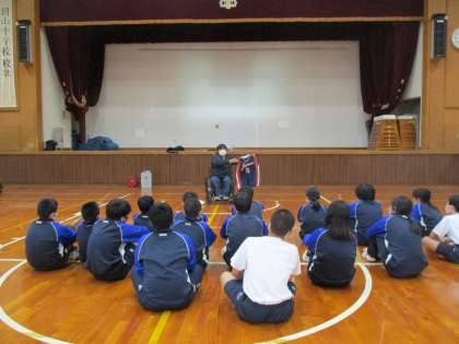 初めは阪根さんの自己紹介と現役時代活躍されていた時に映像を見ました。ロングシュートが決まると「おぉ〜」と感心の声が漏れていました。また,日本代表として実際に着用されていたユニフォームや選手村に入るためのIDカードを見せてもらうと,全員が食い入るように見つめていました。その後,競技用の車いすとそのほかの車いすの違いなどの説明を受けました。