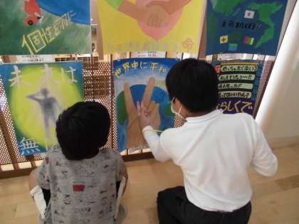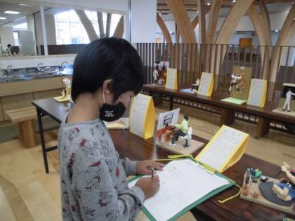 ずらっと展示された1年生から9年生までの作品を一つ一つじっくり鑑賞しました。いいなと思った作品については,作品名といいと思った点をカードに記入しました。途中,「先生,カードが足りません。」というほど,たくさんの作品のいい所を見つけていました。
