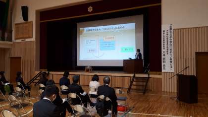 研究報告会全体会では,本校の取り組んできた研究『9年間の連続性と系統性のある学びの中で,豊かな言語能力と地域創生力を育む』について,研究主任が報告を行いました。