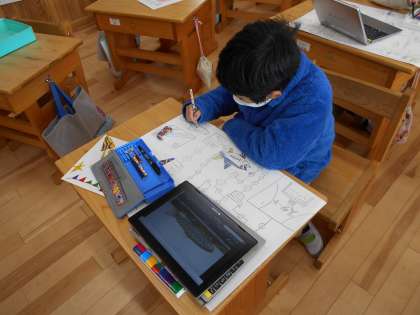 図画工作科の時間にすごろくづくりをしました。ルーレットや動かすコマも自分たちで作っています。テーマを決めて,お話形式で遊べるすごろくが出来上がりました。