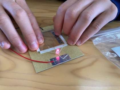 完成したタッチパネルを光らせ,「楽しい」「いろいろな色があってきれい」だと喜んでいました。