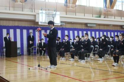 本日,京都京北小中学校第2回目の卒業証書授与式を来賓・保護者の皆さまの参列のもと,挙行いたしました。PTA会長様からは,「未来に向かって前へ前へと進んでいきましょう。」と温かな励ましのお言葉をいただきました。卒業生たちは,本校での多くの思い出を胸に刻み,晴れやかな姿で巣立っていきました。これからの人生,健康を大切にし,人として大きく成長してくれることを期待しています。ご参列いただきました皆さま,卒業生たちの門出を祝っていただき,誠にありがとうございました。