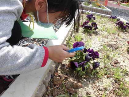 理科の学習では,虫メガネを使って,植物や虫の観察をしています。虫眼鏡を使って細かいところまで観察することが出来ました。