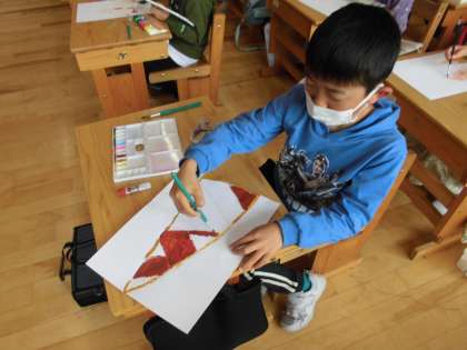 図画工作科の「季節の絵」では,絵の具を使ってタケノコに色を塗る活動をしています。茶色でも水の量によって色の濃淡を表現できることに気づいた子たちは,少しずつ絵の具の色を変えながら塗っていました。