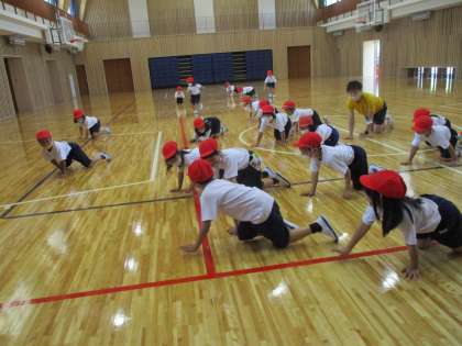 初めは先生のまねをしていましたが,ペアでリーダーを決めてまねっこをしたり,全体のリーダーをしたりしてやる気満々で体を動かす子ども達でした。