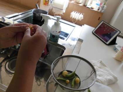 畑で収穫したスナップエンドウとジャガイモを使いました。