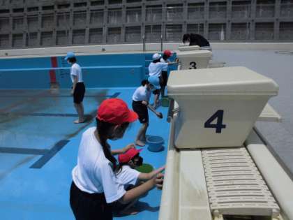 5年生からのプール掃除のバトンを受け取り,仕上げは6年生がピカピカにしていきました。天気もよく,気温も高かったので,水を使いながらの掃除を楽しんでいました。