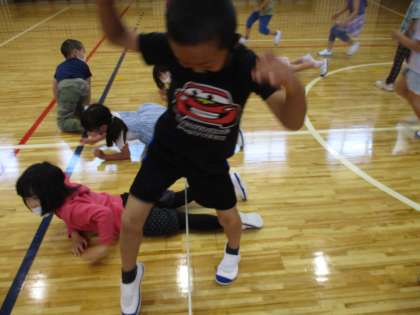 今日は1年生が体育館で縄跳びを使って縄に当たらないように飛び越えたり,くぐったりして体を動かしました。
