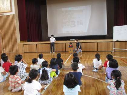 3組さんのお友達のお名前や教室をクイズ形式で知り,バルーンであそんだり,ボール運びをしたりして楽しみました。