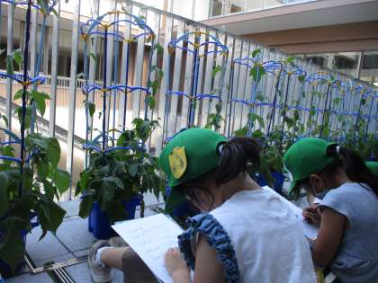 春に植えたアサガオ種は芽を出し,どんどん大きくなってきています。