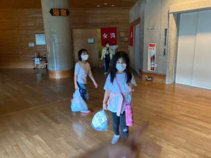お風呂に入ってリフレッシュし、次のキャンプファイヤーを楽しみにしているようです!
