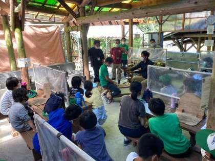 2日目の活動「火おこし」が始りました。まず,花背山の家の先生が見本を見せてくれています。5分もたたず煙が出てきましたが…みんなはすぐできるか、不安そうです。