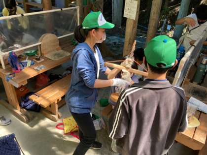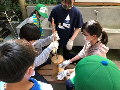 グループで協力して火おこししています。どの班も上手にできています。ついた火はろうそくにうつしてこの後の野外炊飯の火にします。