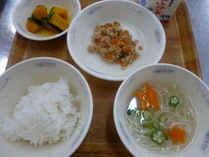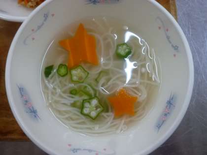 七夕には,天の川や織姫の織り糸にみたてて「そうめん」を食べる風習があります。今日は,そうめんに,星を散らせた七夕そうめんを作りました。みんなの願いが叶うようにと,給食調理員さんは七夕そうめんのにんじんをすべて星にしてくださいました。にんじんとオクラの星に願いを込めて食べてくれたと思います。