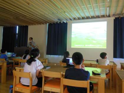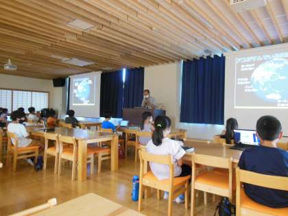 7月7日(木)京北ふるさと未来科の学習で,「アユのくらしを知ろう!」というテーマで京都市産業観光局の方にお話ししていただきました。一般的にアユは10月ごろから川を下りその後,小石のある底で卵を産み生まれたアユの子どもは,川の流れに乗って海まで行きそこで海の豊富なプランクトンを食べて成長し川を上がることを写真や動画を使い教えてもらいました。