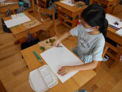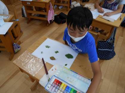 今日は、身近な自然の形・色という単元で、拾ってきた落ち葉や石などを題材に、画用紙に絵を描きました。同じ葉っぱでも微妙に色が違うことに気づいた子たちは、絵の具を上手に混ぜて色を作っていました。