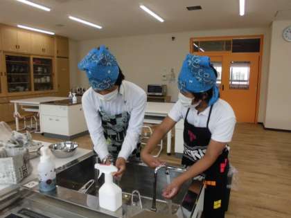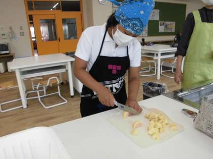 ジャガイモを洗い、皮をむくところからスタートしました。9年生の生徒は、次の工程に必要な器具を出し、下級生に指示を出してくれました。