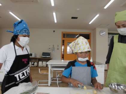 3年生と6年生の生徒は、必死に真似をして皮をきれいにむいたり、材料を切ったりしました。