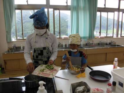 9年生の生徒がベーコンを星型に切るのを見て3年生の生徒も負けずに三角形に切りました。ちょうど算数で学習しているところなので、「これは三角形、これは四角形」と言いながら、切っていました。